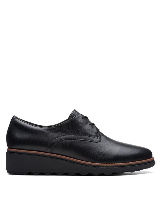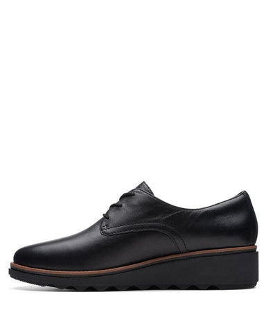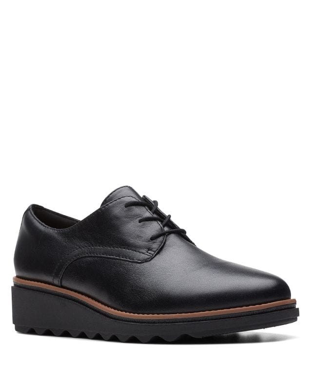 Look chic and stay comfortable all day in this sophisticated Sharon Rae black wedge boot from Clarks and crafted from leather and set on a wearable wedge heel. Platform oxford silhouette with a full lace closure. Textile insole features targeted padding for added comfort. The Sharon Rae black platform shoe is designed with a grippy outsole.