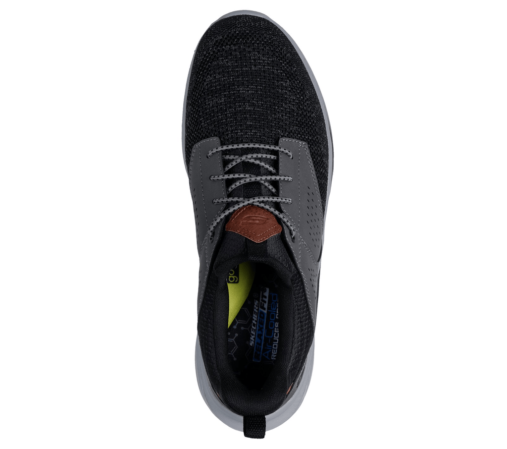 Classic modern style combines with comfort in Skechers Relaxed Fit®: Slade - Breyer. This stretch-laced vegan style features a mesh and synthetic upper with a charcoal-infused Skechers Air-Cooled Memory Foam® insole and a Skechers Goga Mat Arch™ for added support.