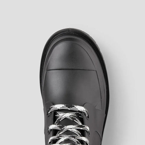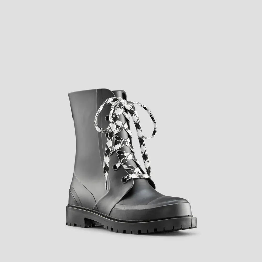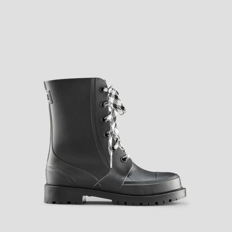 Mid-height Rubber-like compound rain combat boot. Rounded toe. Front closure with flat waxed lace. Rubber-like compound outsole with 1.25 inch block heel.