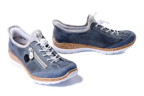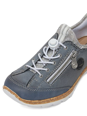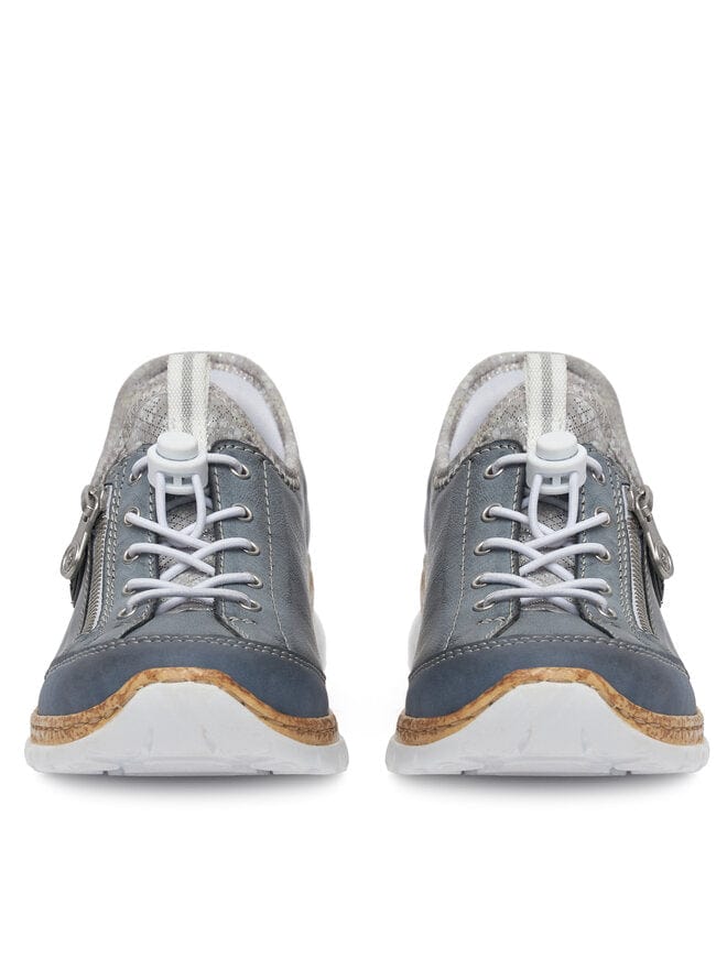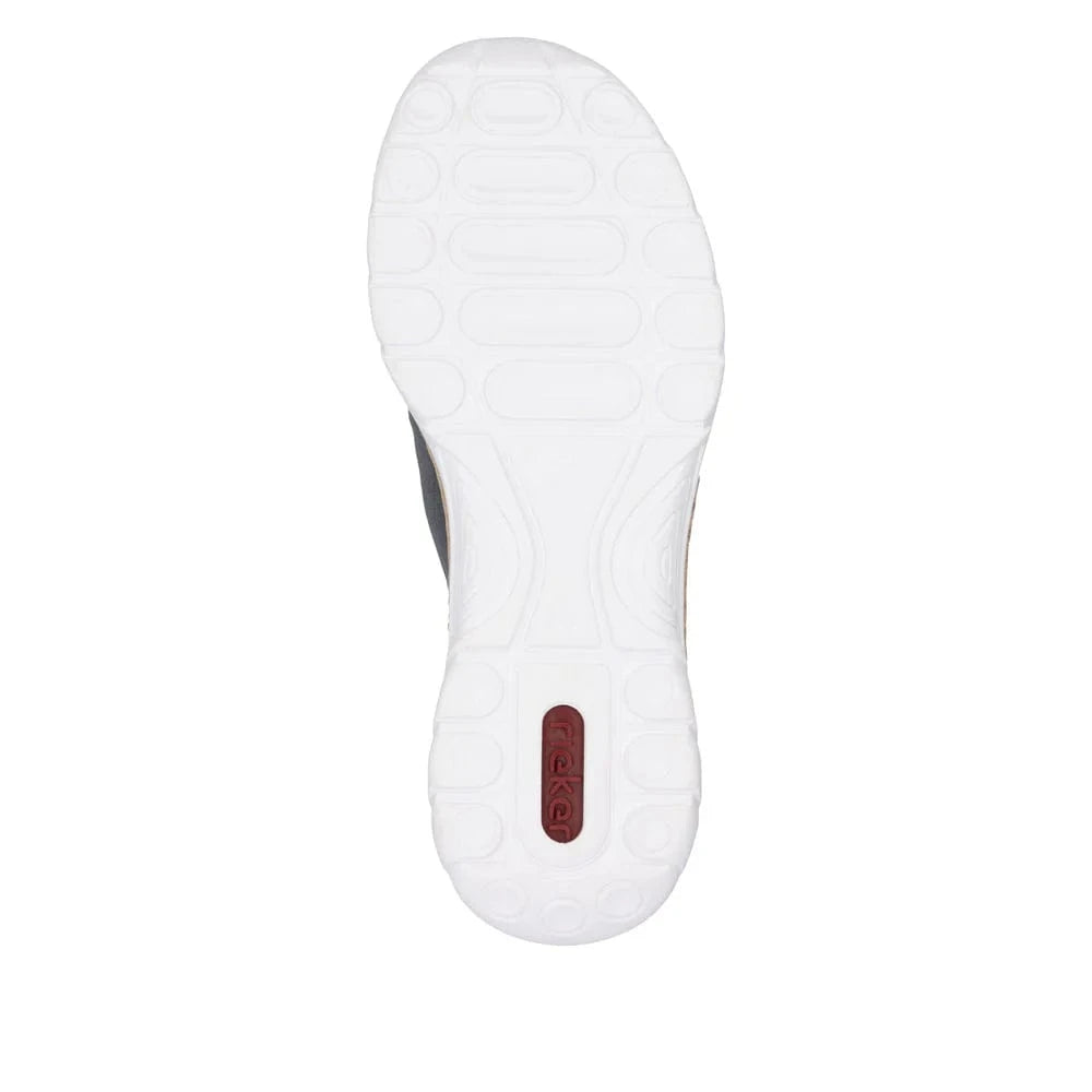 Elegant, but at the same time sporty, these RIEKER shoes. The smooth navy upper is decorated with fine stitching, an embossed logo, and a silver zipper. The upper part of the shoe is complemented by a light elastic material that makes it easier to slip on. You can perfectly customize the shoes by lacing them with flexible rubber bands that can be decently tightened. The unique textile insole made of memory foam softens the foot and adapts to the shape of your foot. The sole made with Antistress technology makes it light and flexible. This model will perfectly liven up your outfits both for work and for errands around town.