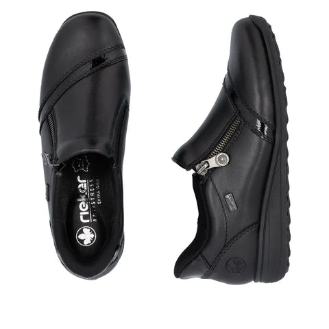 Just slip in and let's go! These black Rieker shoes made of smooth leather combine cool design with best comfort and high functionality. The zipper makes the shoe easy to put on and take off. With the grippy sole, sure-footed walking is a matter of course. The padded and removable insole offers comfort and functionality day after day. The extra width gives the toes more freedom of movement. The RiekerTEX membrane provides reliable protection against wind and moisture, while the Ready2GO feature makes it particularly easy to slip into. Just slip into it and feel good!