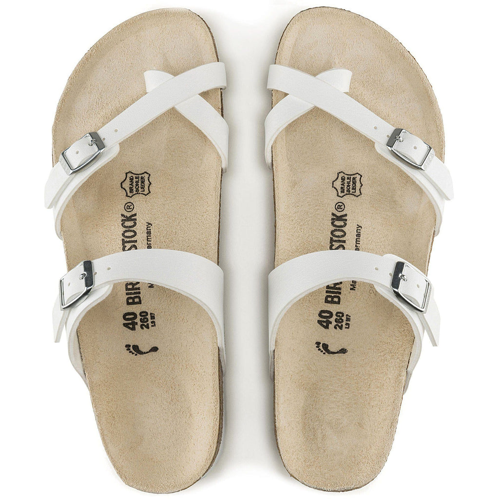 Supremely comfortable with sophisticated, crisscross straps, the Mayari redefines the thong sandal with a single toe loop. Birko-Flor® adds a smooth finish to the everyday favorite. Complete with classic BIRKENSTOCK design elements, like adjustable buckle closures and a contoured footbed for the ultimate in support.