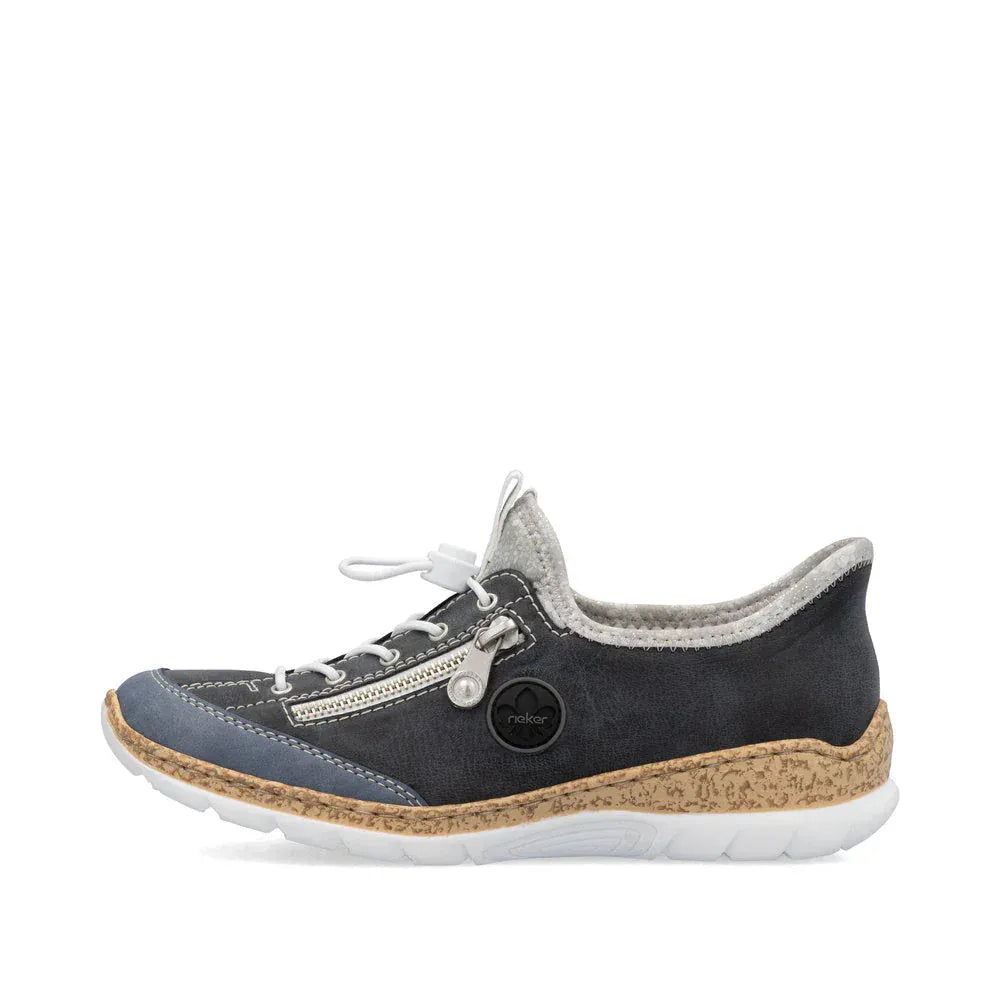Elegant, but at the same time sporty, these RIEKER shoes. The smooth navy upper is decorated with fine stitching, an embossed logo, and a silver zipper. The upper part of the shoe is complemented by a light elastic material that makes it easier to slip on. You can perfectly customize the shoes by lacing them with flexible rubber bands that can be decently tightened. The unique textile insole made of memory foam softens the foot and adapts to the shape of your foot. The sole made with Antistress technology makes it light and flexible. This model will perfectly liven up your outfits both for work and for errands around town.