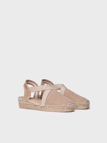 VERDI-V. This women's flat vegan espadrille is made from cotton fabric in plain colours. The jute wedge is 4 cm high. The base of the sole is made of non-slip rubber. It has two contrasting elastic straps that provide optimal support to the foot. The inner sole is lined with fabric for added comfort. The fabric and sole are hand-stitched together with high-quality cotton thread. This product is 100% vegan.